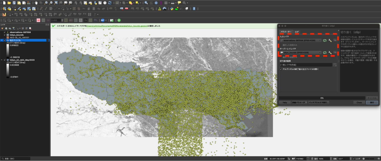 生物観察データの切り抜きは「ベクタ → 空間演算ツール → 切り抜く(Clip)」より選択できます。入力レイヤはiNaturalist観察データ、オーバーレイレイヤは東京都の行政区域データを設定して、実行してください。データ量が大きく、M1 MacBook Airではこの処理に15分ほどかかりました。