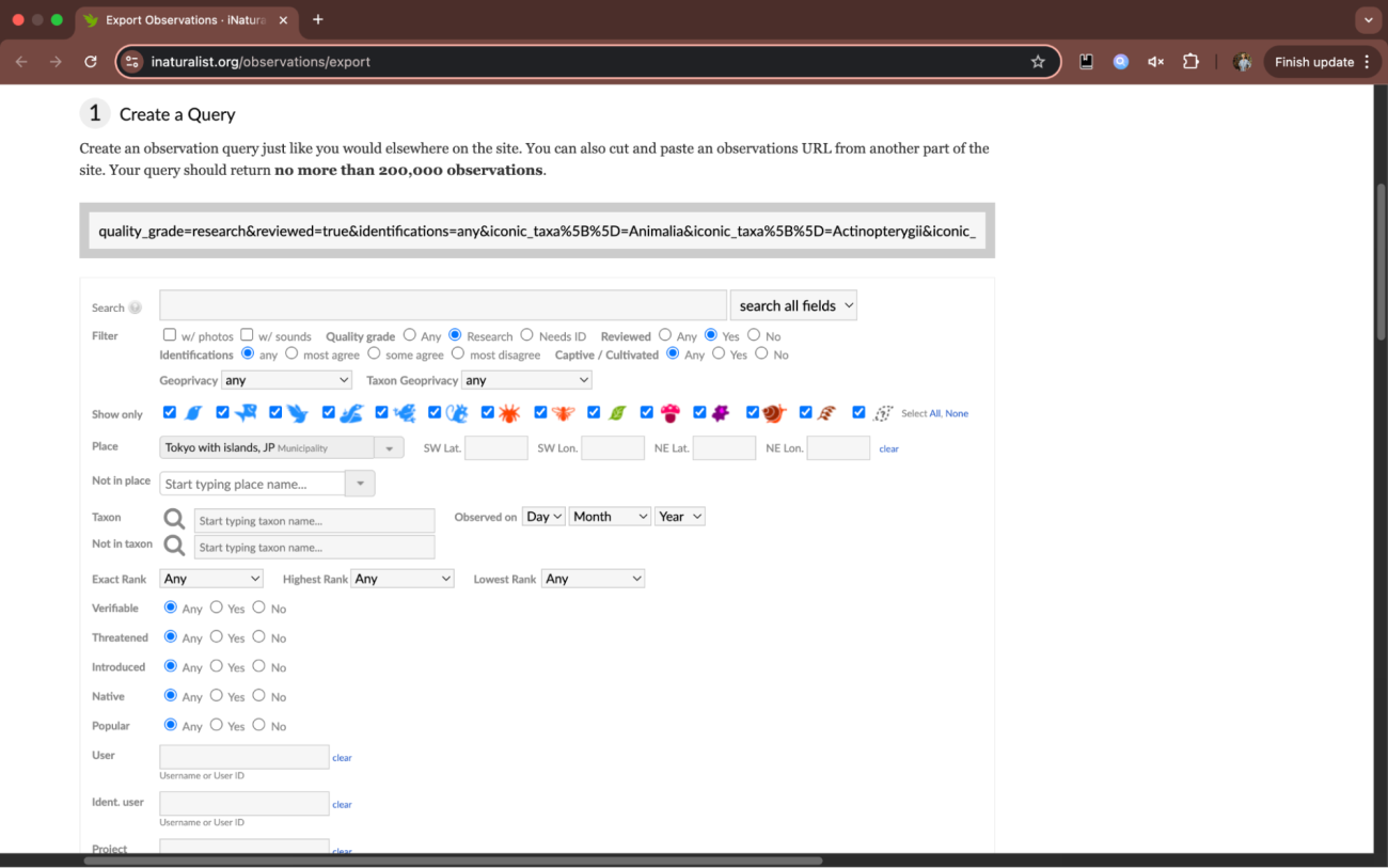 iNaturalistのExport画面から、観察記録データ(CSV形式)を取得できます。今回は東京都内の生物全体の記録が欲しかったため、以下の条件で絞り込みを行いました:
