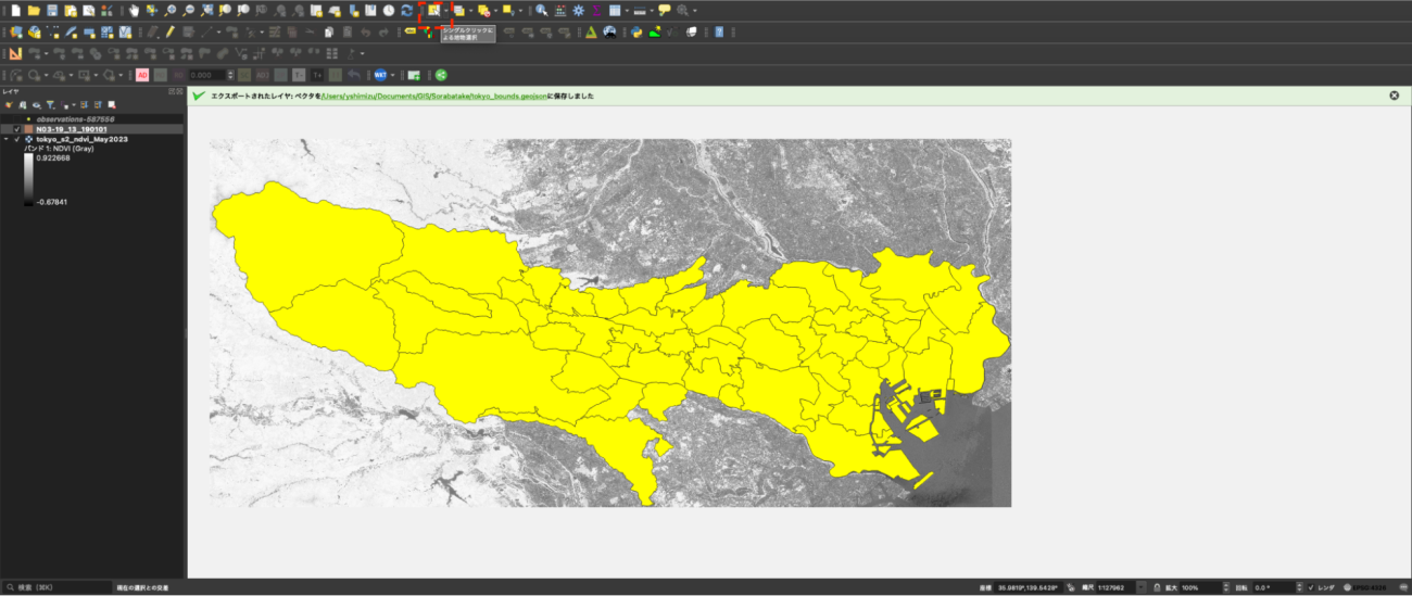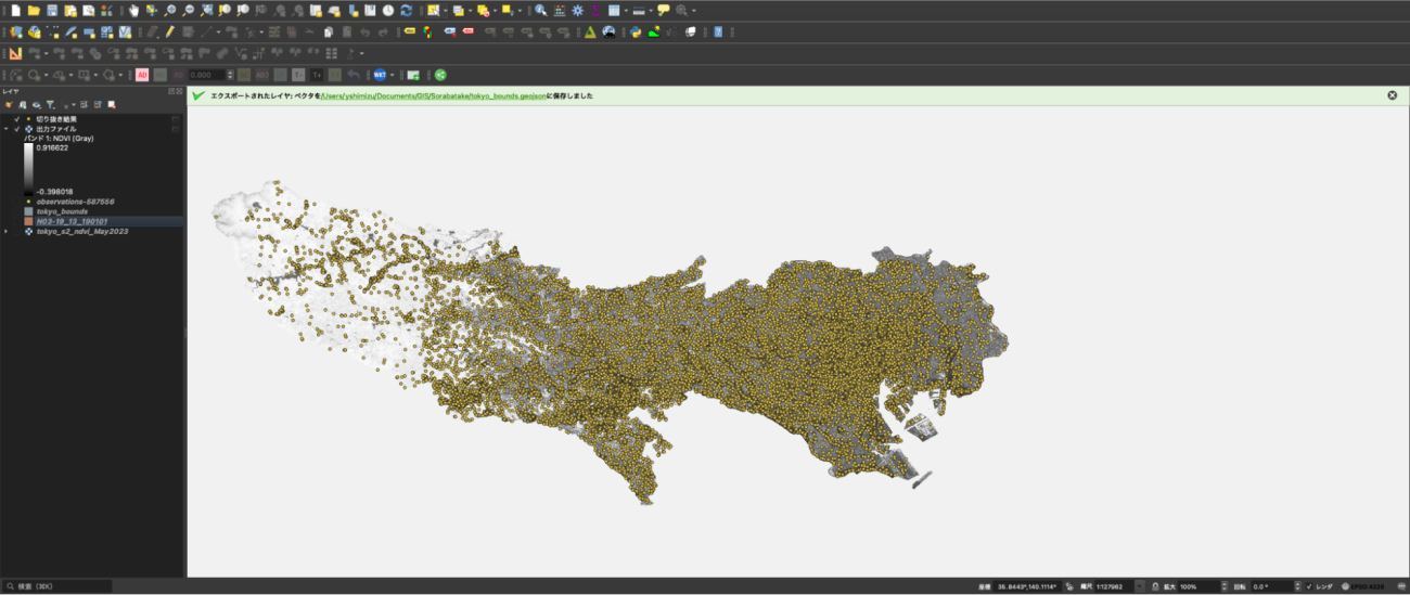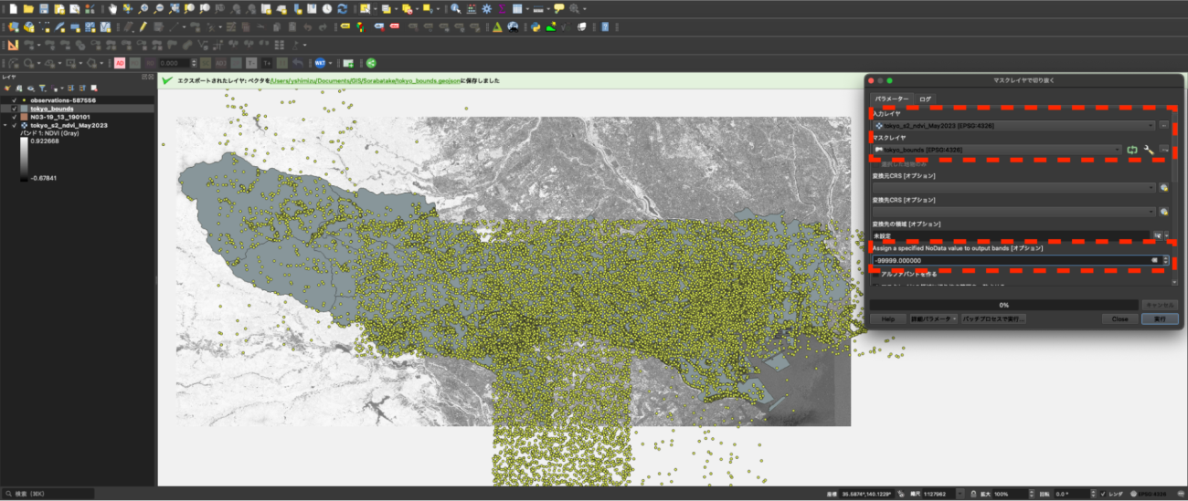 新たに作成した、東京都の行政区域データを使って、NDVIデータとiNaturalist観察データデータを東京都の形に沿って切り抜きます。