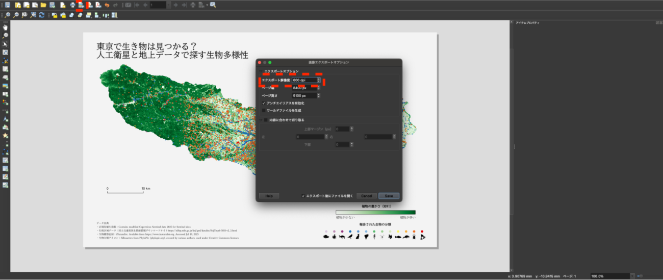 地図を出力します。画面左上の「画像としてエクスポート」をクリックし、画像として保存します。今回は解像度を600dpiに設定しました。解像度を高くすると仕上がりがきれいになりますが、書き込み時間も長くなります。用途に応じて、解像度と処理時間のバランスを見て設定してください。