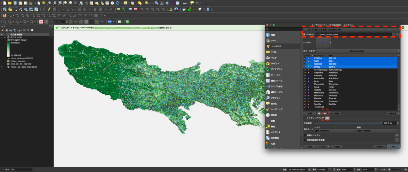 iNaturalist観察データの色分けもNDVI同様にシンボロジから設定ができます。上部で「カテゴリ値から定義」を選択し、「値」には「iconic_taxon_name」とします。