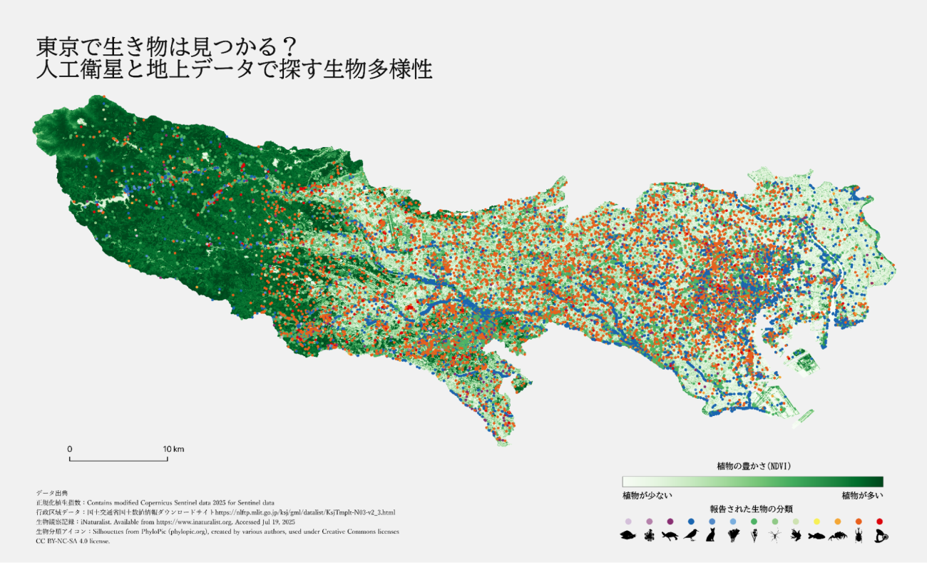 多摩地域などの山間部はNDVIの値が高く、衛星データからも自然の豊かさがよく分かりますが、観察記録は少なく、「人の視点」が届いていない印象を受けます。 人のアクセスが限られていたり、記録投稿のハードルがあるのかもしれません。逆に都心部では、緑は少ないものの観察記録が集中しており、限られた自然に人の関心が集まっていることがうかがえました。今回の地図は「自然がどこにあるか」だけでなく、「人がどこで自然に関心を持っているか」も可視化していると感じました。