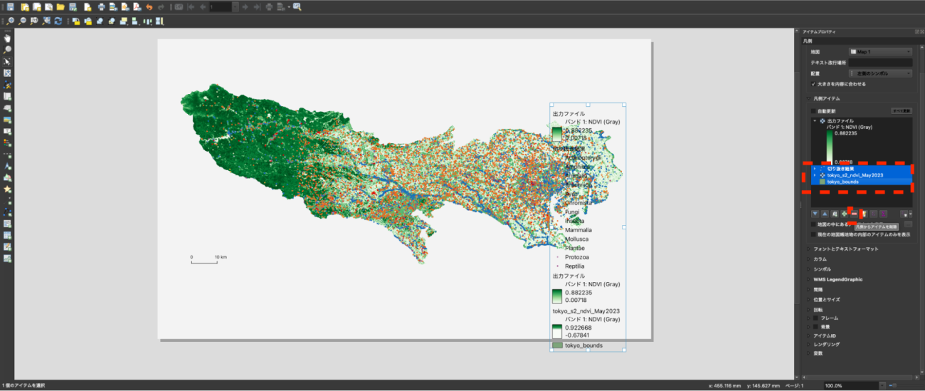 次に、凡例を追加します。左端の「凡例を追加」を選択します。ここでは、NDVIの凡例のみを編集したいので、他のレイヤ分は削除します。