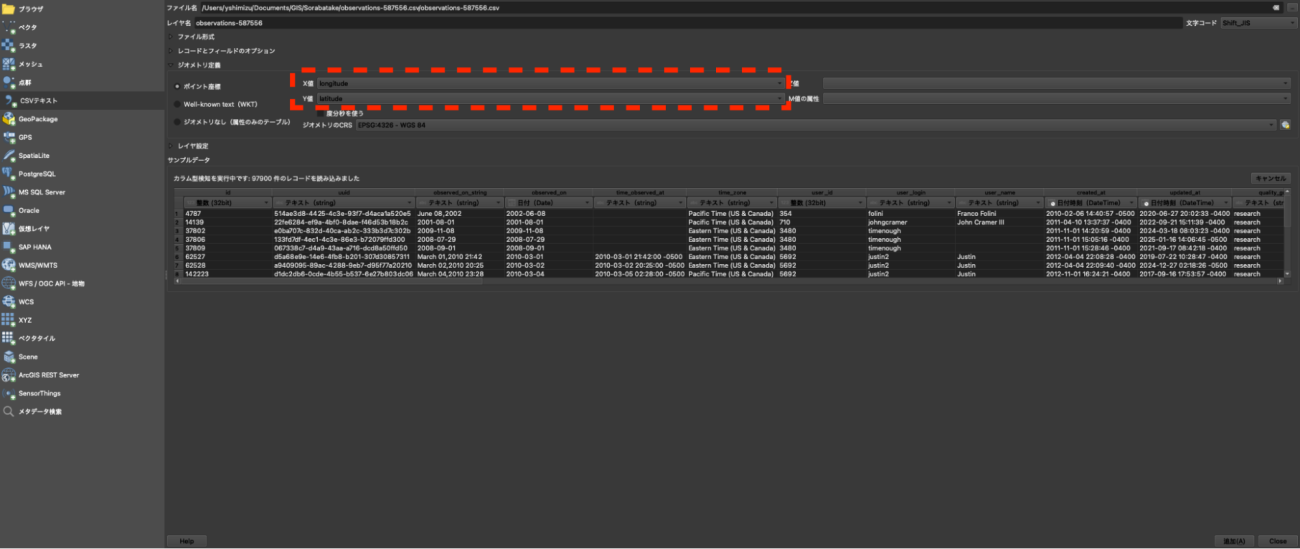 iNaturalist観察データはCSV形式のため、画面上部ツールバーから「レイヤ → データソースマネージャ → CSVテキスト → ファイル名」を選択して、データをアップロードします。