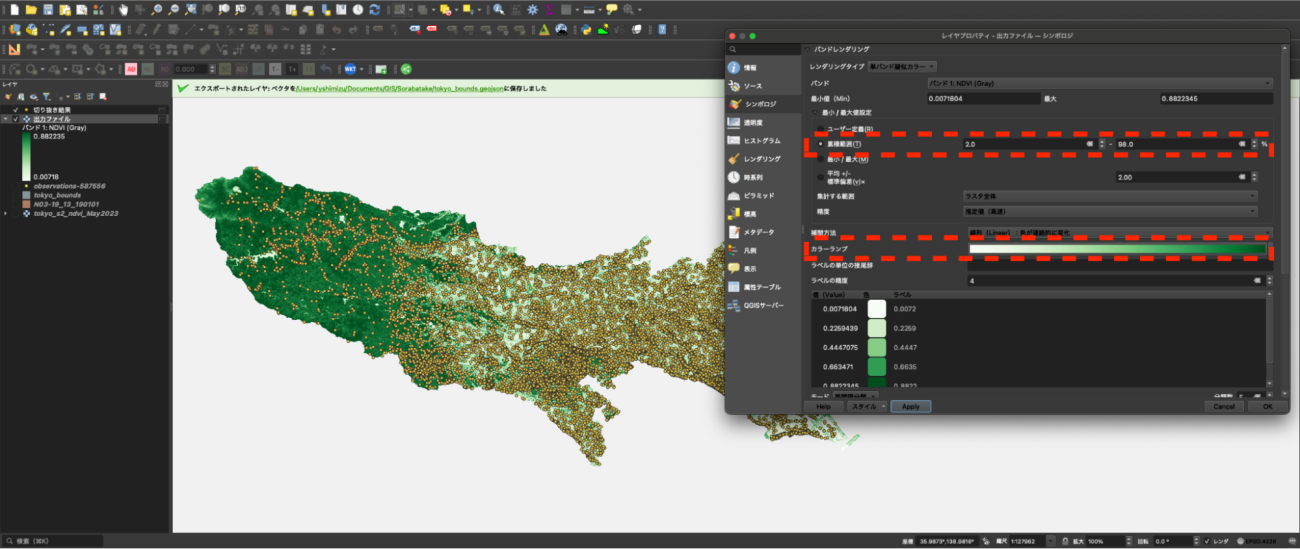 NDVIの値に応じたカラースケールは、植生の濃淡が直感的に伝わるよう、緑系の配色とします。「レンダリングタイプ」を「単バンド疑似カラー」として、「カラーランプ」を「Greens」とします。また、極端な値に影響されないように最小値を2%、最大値を98%と設定すると、植生分布の色のコントラストを出すことができます。