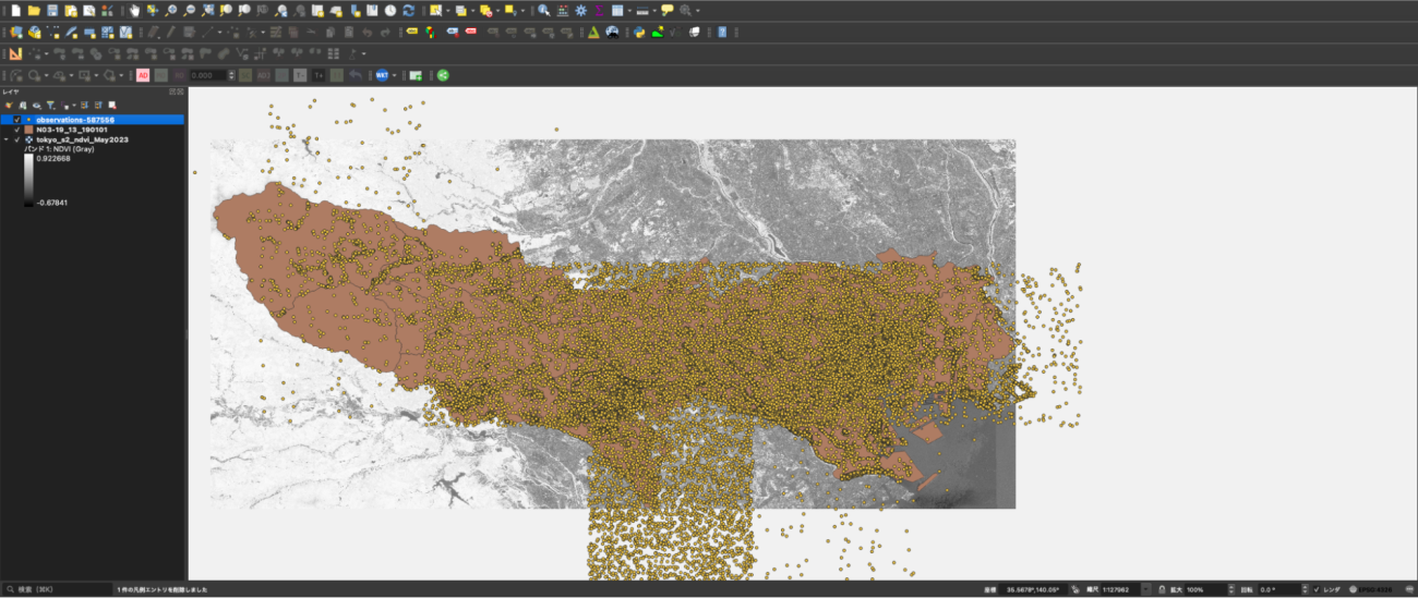 次に、多摩地域まで範囲を広げて、23区との植生の対比を試してみました。NDVIの値が高い森林や緑地は濃い緑で示され、観察報告のプロットは赤い点として現れます。一方、建物が密集する都心部など植生が乏しい場所は白や淡い色で表示されます。その結果、都内の緑の分布の違いがより際立ち、生物観察の報告が23区に集中していることも見えてきました。