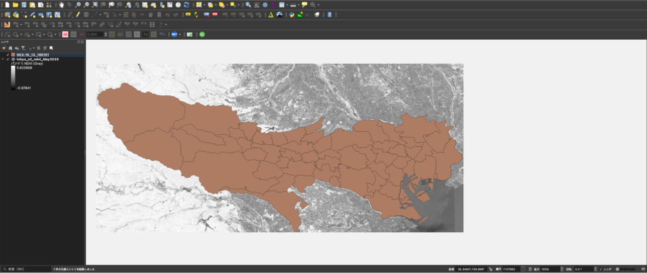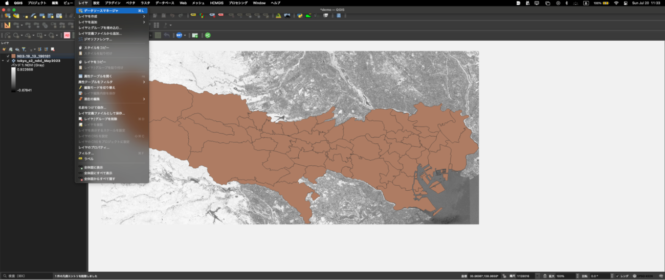 コンピュータ上のダウンロード先からQGIS画面上にドラッグ&ドロップをして、NDVIデータと東京都の行政区域データをアップロードします。