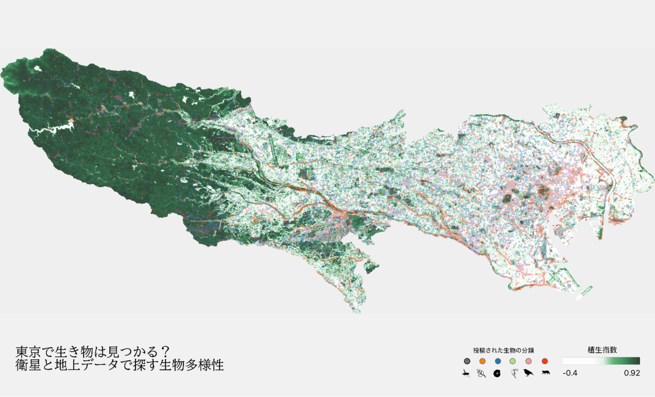 「東京=人工的な都市空間」という一般的なイメージに対して、どこに、どんな生き物や植物が分布しているのかをデータで整理し、地図として可視化してみます。