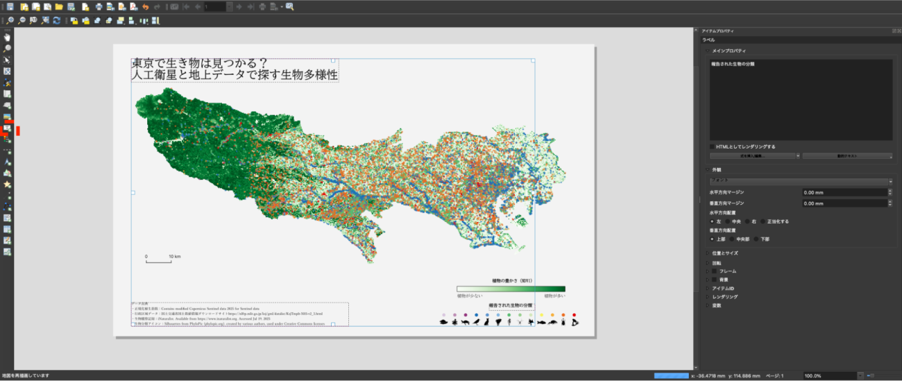 最終形では、色彩がより際立つように全体の調整を加えました。植生レイヤーの最大・最小値を2~98%の範囲に設定したことで、明るさと濃淡のコントラストが強まり、生物の分類数に合わせたカラーパレットの設定で、鮮やかな印象となりました。タイトル、縮尺、凡例、出典のバランスが良くなるように配置も工夫しました。