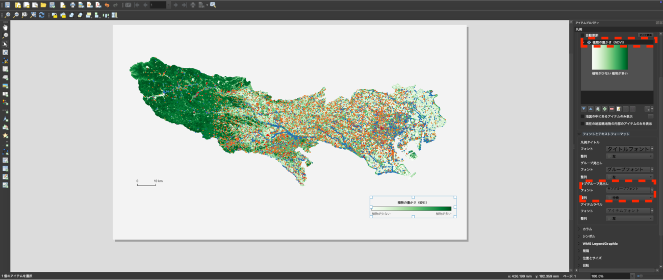 最後に、タイトルやテキストボックス、凡例、縮尺を地図上に配置し、完成形に仕上げていきます。