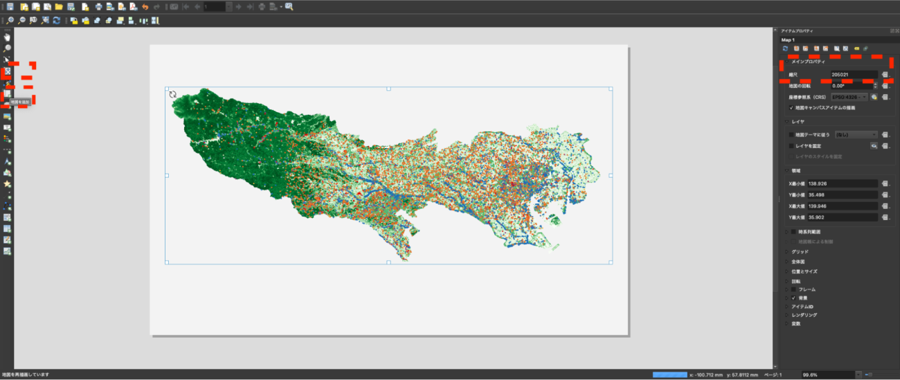 無地のキャンバスに左端の「地図を追加」を選択して、地図を挿入できます。位置やサイズは左端の「アイテムコンテンツを移動」や「アイテムプロパティ → メインプロパティ → 縮尺」から選択できます。