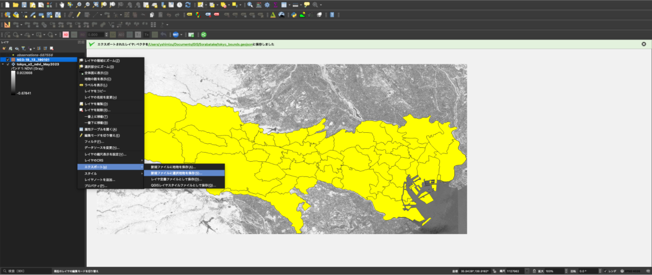 選択ができたら、「エクスポート → 新規ファイルに選択地物を保存」を選択します。