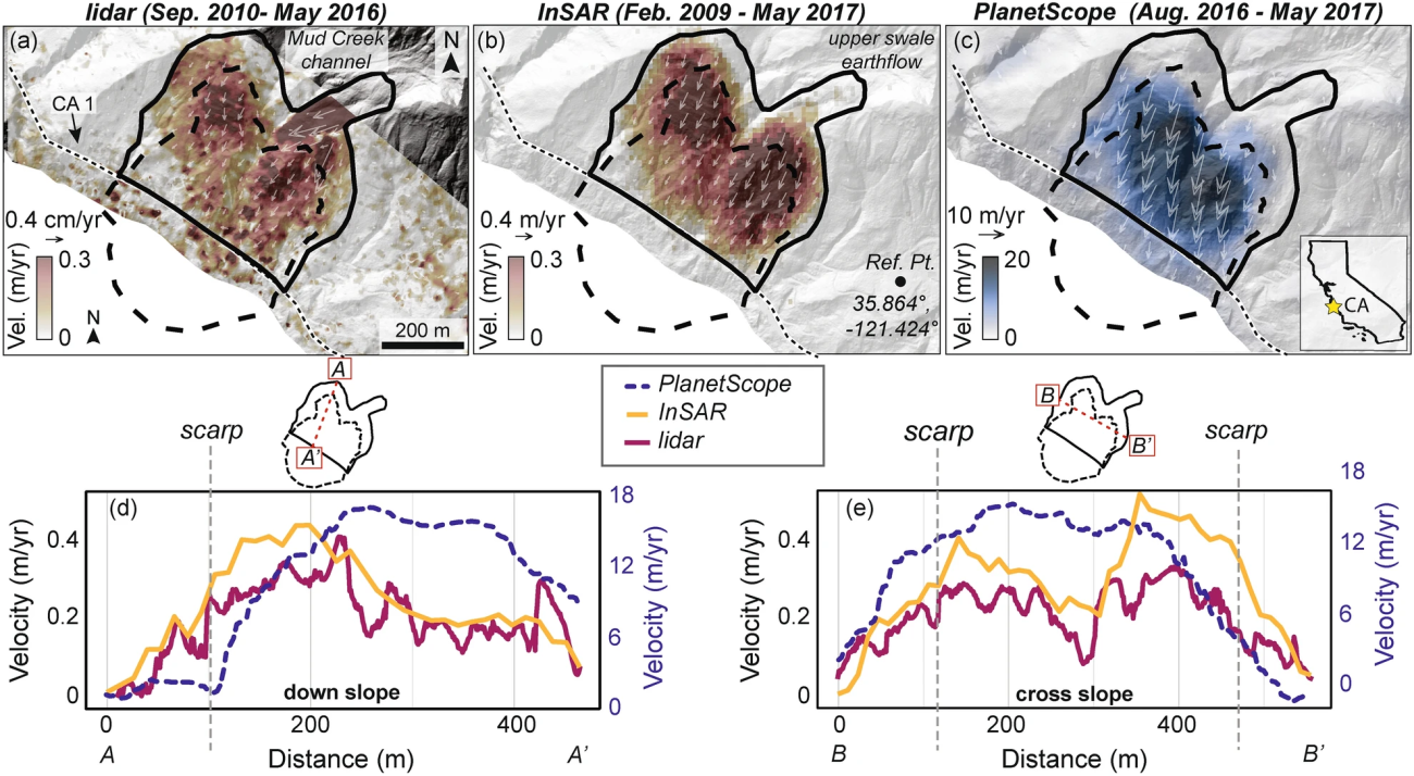 ・InSARとLidarでは、2009–2017年のMud Creekは年間数十cmレベルで「ゆっくり動く」スロー・スライドであった