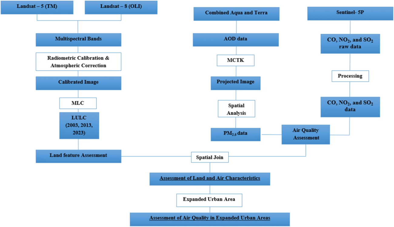 ・本論文は、20年間(2003, 2013, 2023)の衛星画像(Landsat)で農地と都市域の変化を調べ、同時期の大気汚染(PM2.5, CO, NO₂, SO₂)を別の衛星(MODIS, Sentinel-5P)で観測し、都市スプロール(都市がじわじわ広がる現象)が、大気質の悪化にどの程度寄与したかを定量化する