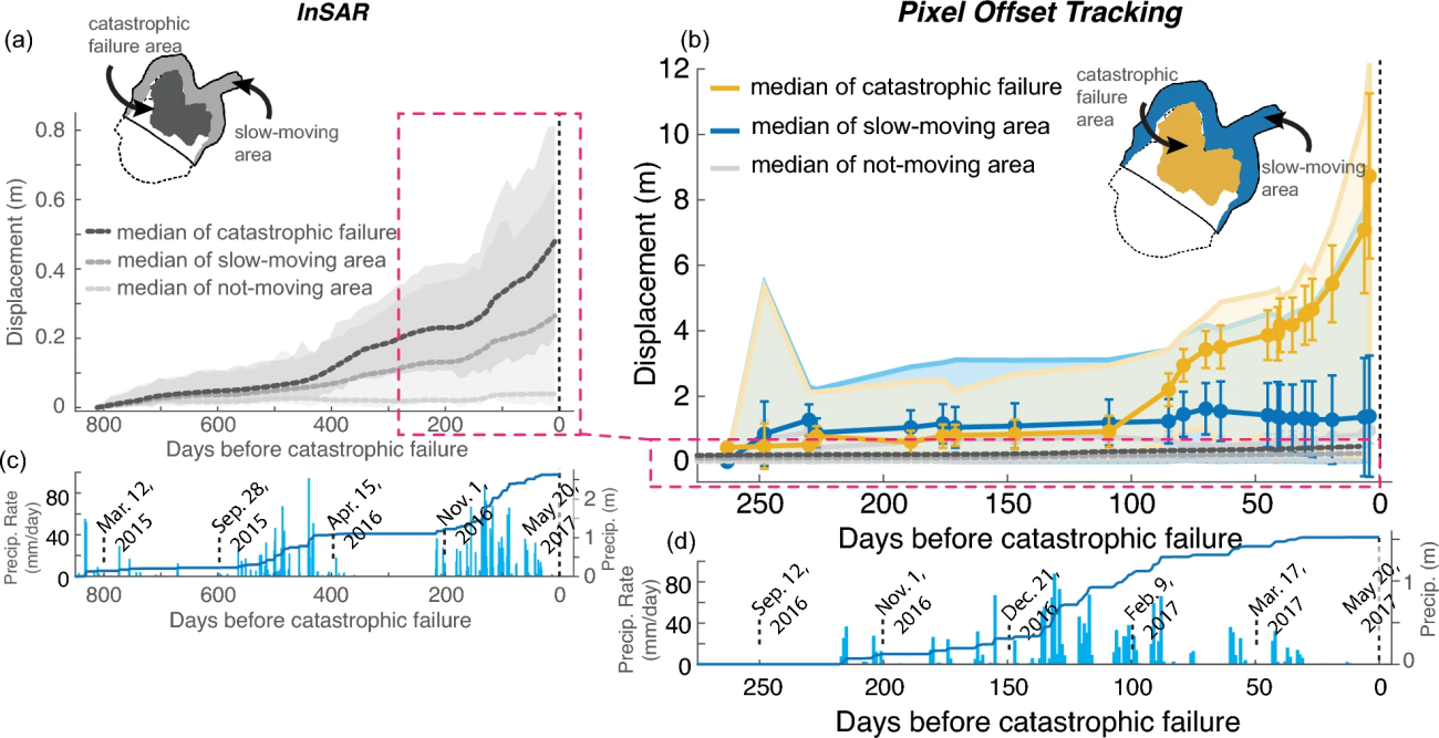 ・すなわち、InSARは緩やかな変動を長期的に追うのに有効だが大変位には弱く、一方、PlanetScopeは短期的な急加速をとらえ、両者を補完的に利用することで崩壊直前の危険な加速を可視化できる