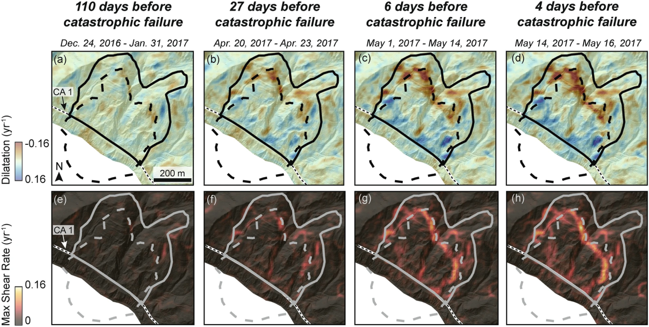 ・6日前には最終的な滑落崖とほぼ一致する場所に「せん断集中」が現れることが確認できた