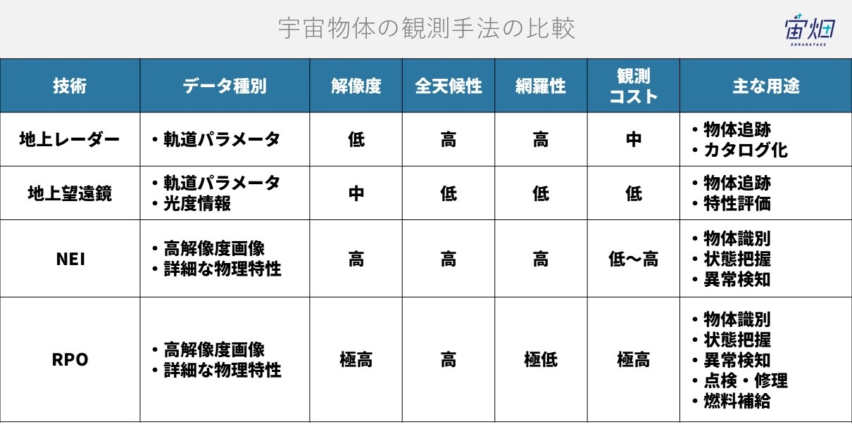 NEIの特徴をより明確にするため、主要な物体観測手法について、以下の表で比較します。