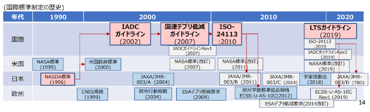 この宇宙開発に関わる法整備の課題へのアプローチにも変化が見られています。例えば、宇宙サステナビリティの分野では、歴史的にトップダウンのガイドライン策定が先行しました。2002年にIADC(国際スペースデブリ調整委員会)がデブリ低減のための最初のガイドラインを策定し、各国の宇宙機関がトップダウン的に遵守を目指す形から始まりました。その後、2010年代にはISO(国際標準化機構)で国際標準が策定されるなど、ガイドライン作りが進められてきました。