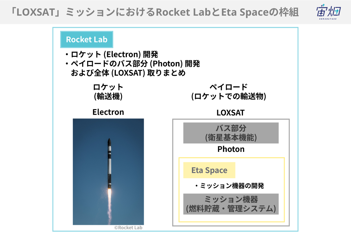 Rocket Labがペイロードの宇宙機本体(バス部分)を担当し、Eta Spaceが実証部分の燃料貯蔵・管理システム(ミッション機器)を担当しています。