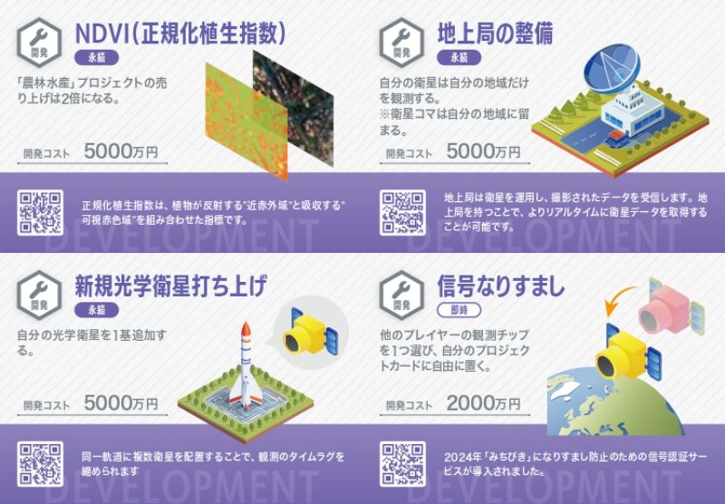 衛星には「光学衛星」と「SAR衛星」の2種類があり、サイコロで出た目に応じて観測を行い、プロジェクトを進めます。光学衛星は雲に邪魔されると観測できない点や、衛星が撮影してほしいタイミングでちょうど良い場所にいない点などはリアルに即したルールになっています。また、地球観測衛星のビジネスで売上を上げるためには、資金を投じて衛星データを扱いやすくするプラットフォームや適切な場所に地上局を配備するといった衛星開発や衛星観測以外の「開発」が戦略上重要です。