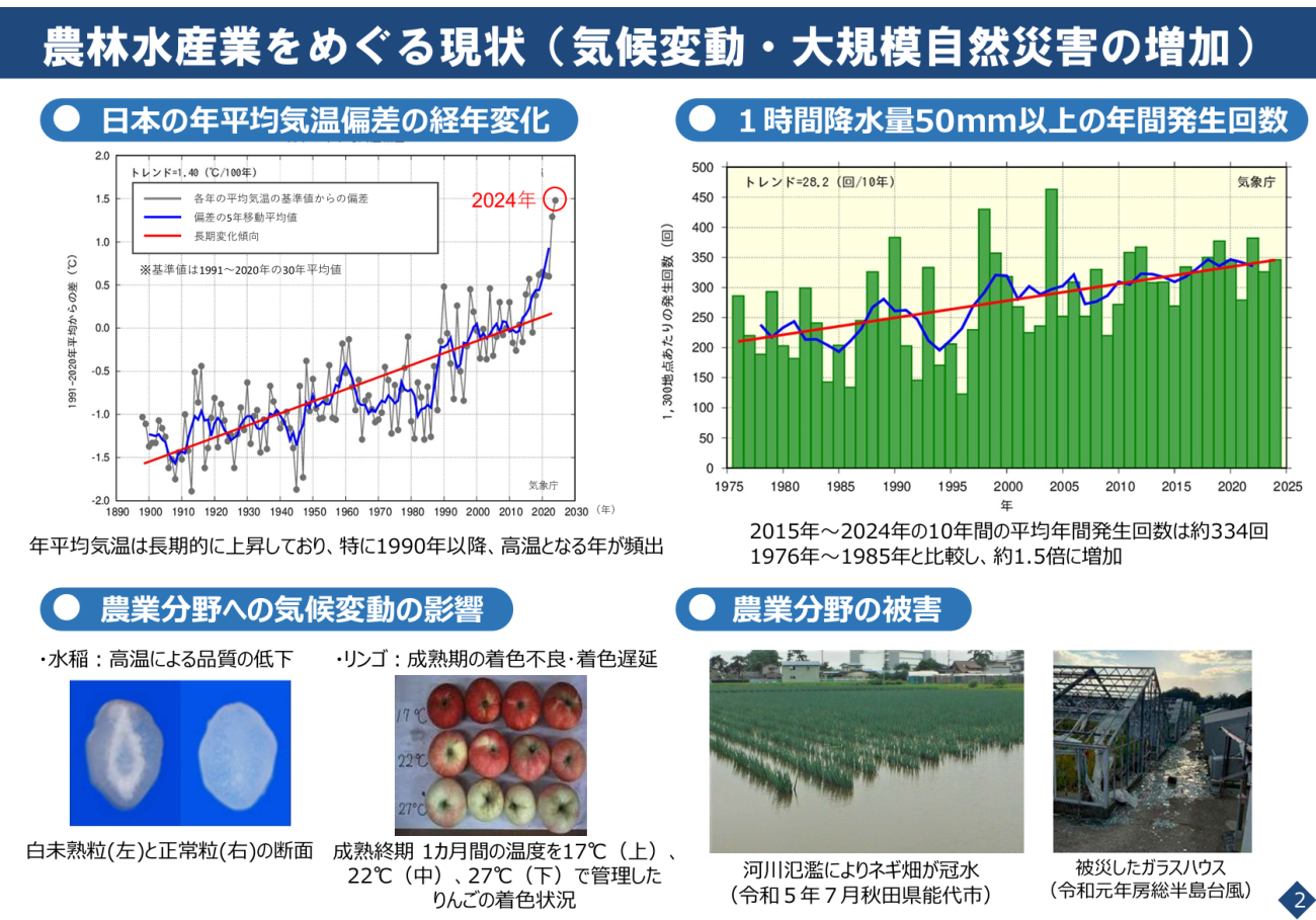 まず、気候変動や大規模自然災害の増加は、農林水産業にとって大きな課題です。この変化は農林水産業に直接関わっていない私たちにとっても身の危険を感じているという人も多いでしょう。