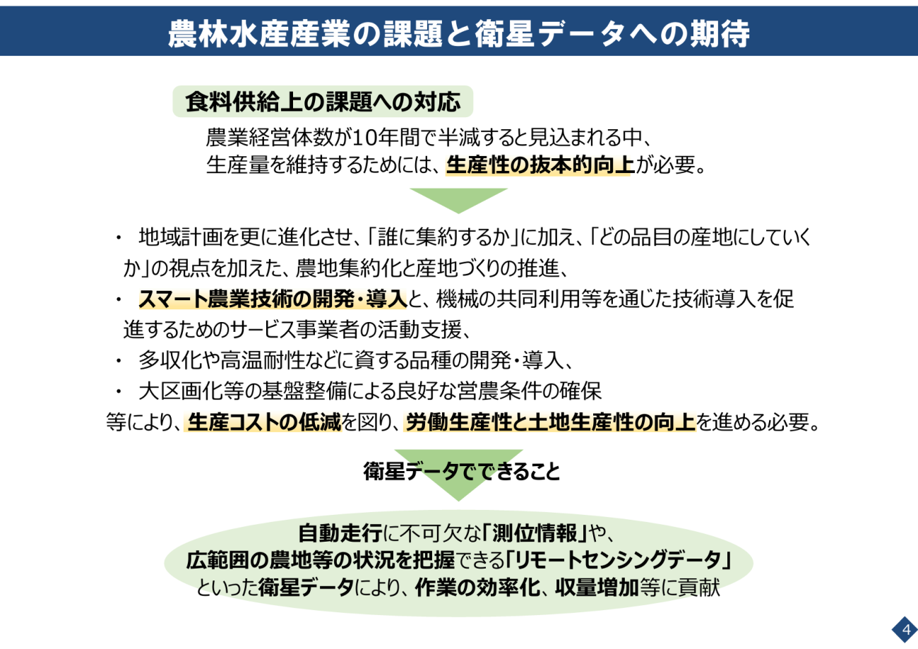 こうした課題の解決には「生産性の抜本的な向上」が必要であり、そのための手段のひとつとしてスマート農業技術の開発・導入が掲げられています。そこで期待されているのが人工衛星です。
