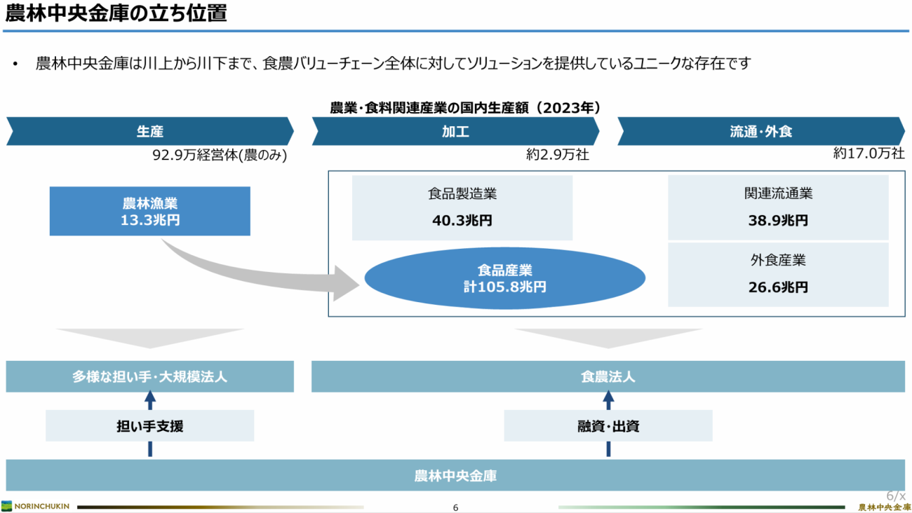 つまり、農林中央金庫は、農林水産業における生産に限らず、物流、そしてさらにはその先にあるビジネスまで一気通貫でのバリューチェーンを常に理解し、見ている組織です。