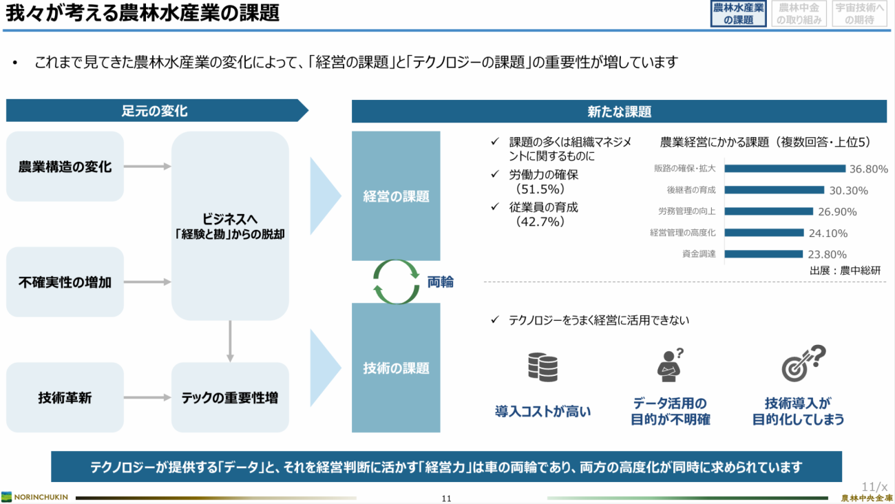 つまり、農林水産業における新しい課題は「経営の課題」と「技術の課題」の2つに分けられ、両輪で解決していく必要があると高橋さんは説明します。
