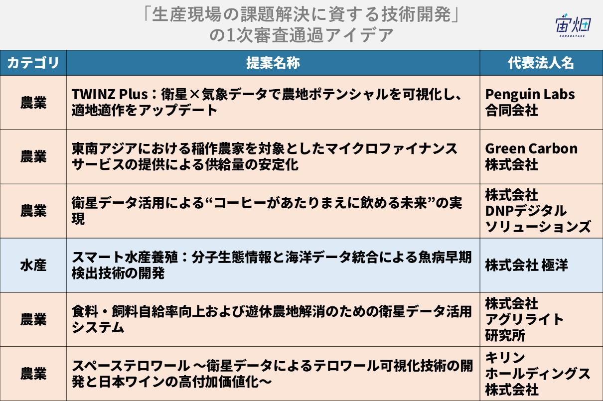 今回のように、これまで衛星データ利用について本格的に考えてこなかったという企業が、関係ある事業ドメイン(今回は農林水産)をフックに衛星データに興味を持ち、事業アイデアまで考えるというのは非常に素晴らしい事例創出のきっかけとなっていることを1次審査通過チームへの直接のヒアリングで実感しました。