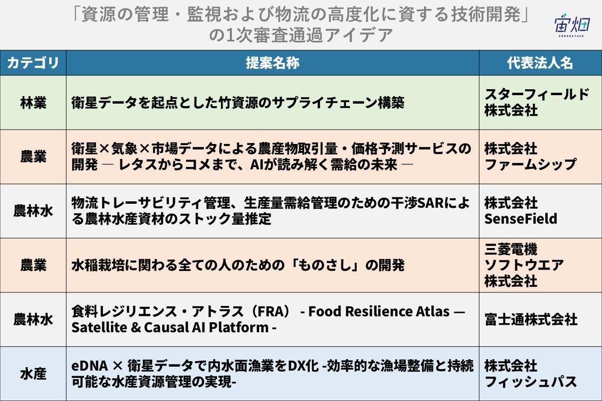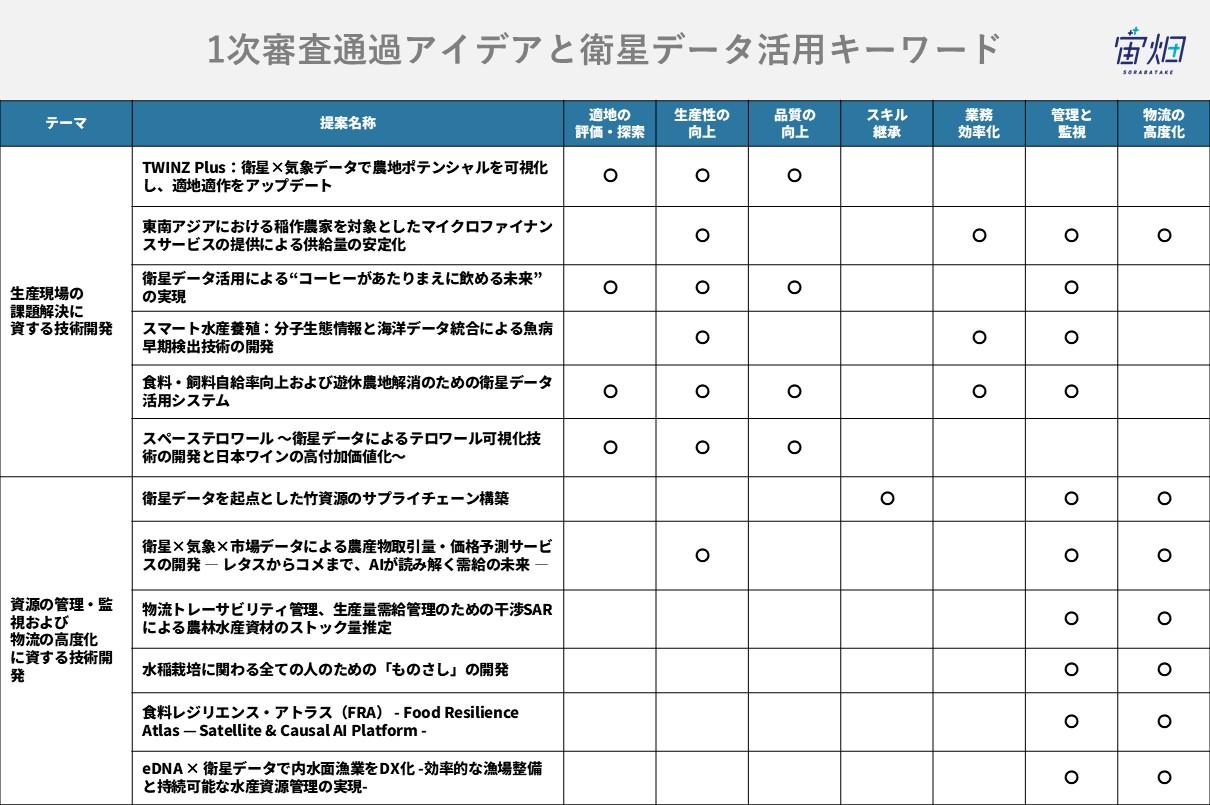 その上で、今回の1次審査通過のアイデアを眺めてみると、「適地の評価・探索」「品質向上」といった上述した5つのキーワード以外の衛星データ活用があると分かります。