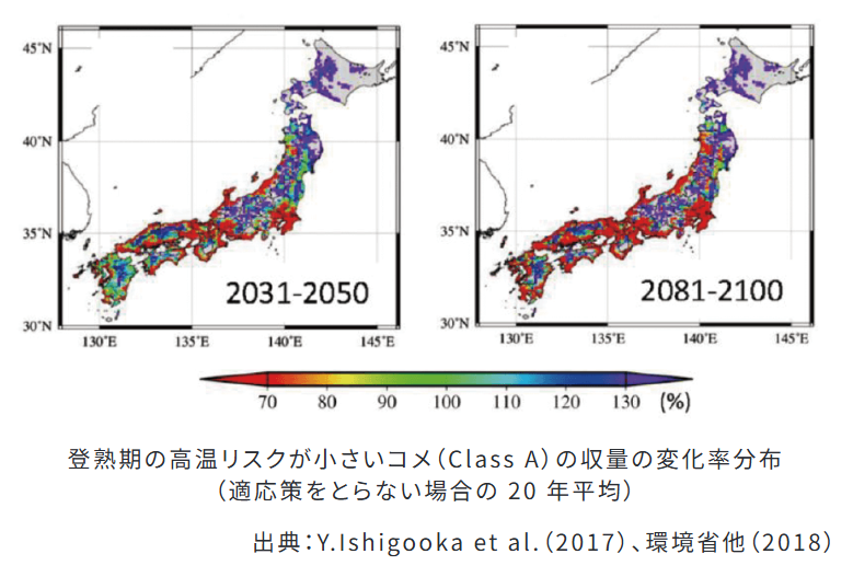 例えば、日本の主食であるお米についても、地球温暖化の対策を何も行わなかった場合、稲の収量が下がる影響があると予測されています。