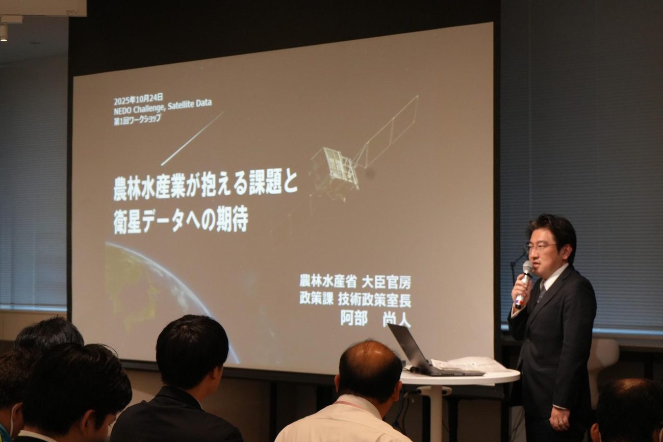 農林水産省・政策課技術政策室の阿部室長からは「農林水産業が抱える課題と衛星データへの期待」と題して、日本の農林水産業が抱える喫緊の課題と合わせて、衛星データのどのような点に課題解決の可能性を見出されているかの説明がありました。