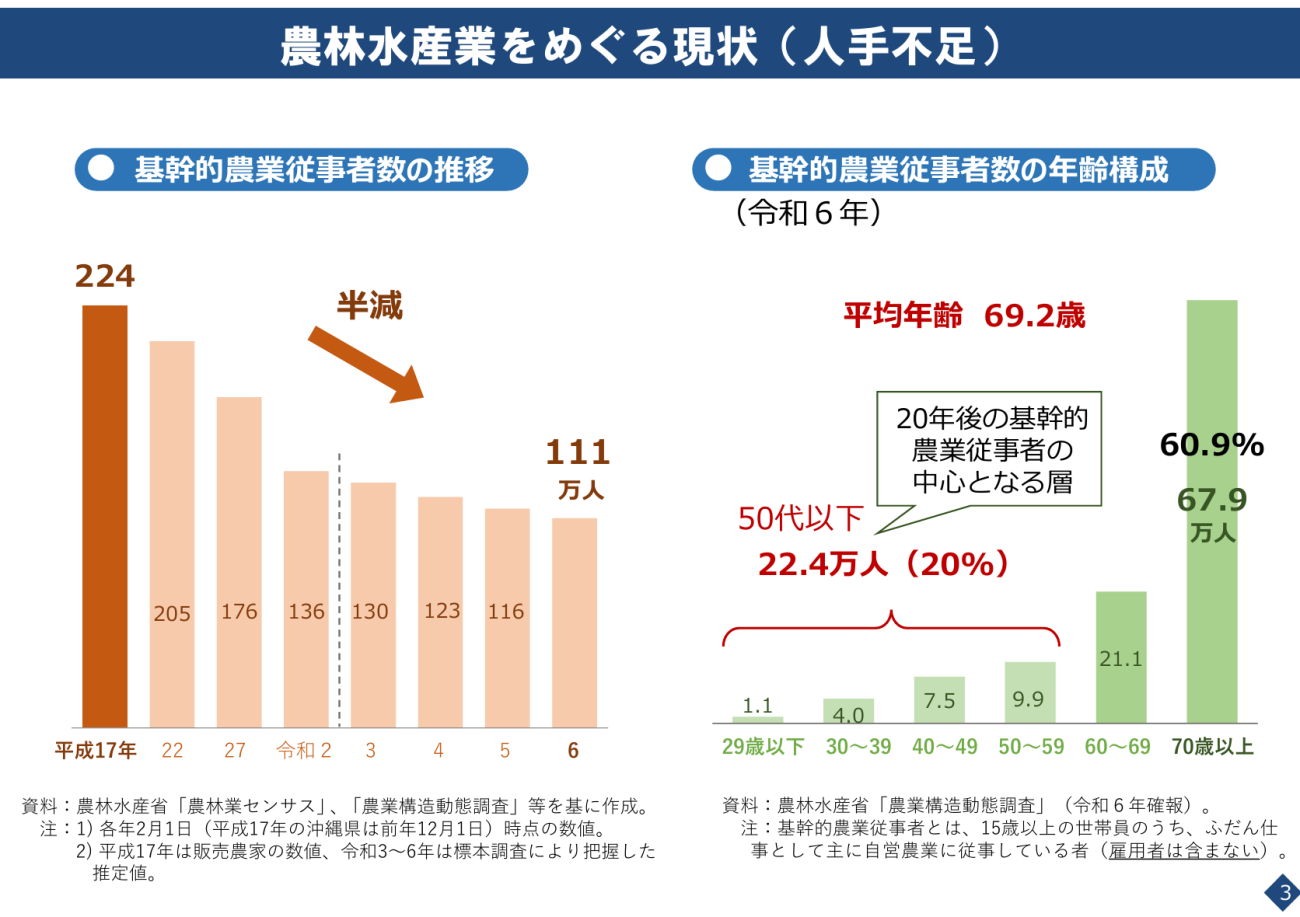 また、農林水産業の課題はそれだけではありません。農林水産業に従事する人の減少、そして少子高齢化も大きな問題となっています。