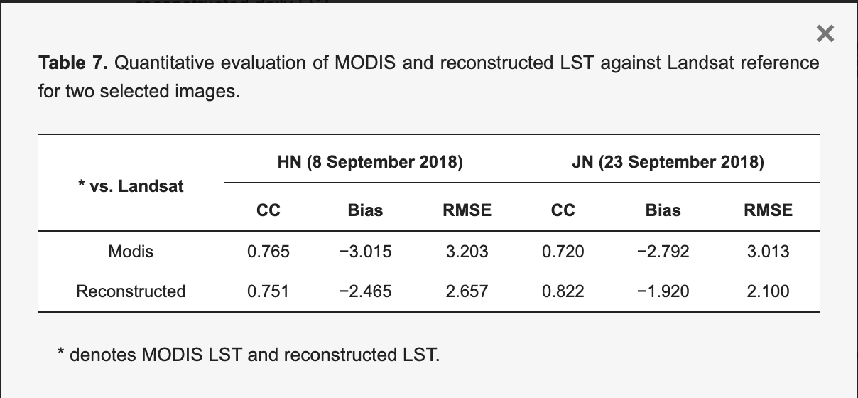 ・別衛星「Landsat」のデータと比較したところ、復元後のMODISデータの方が元のMODISよりもLandsatに近い温度分布を示した