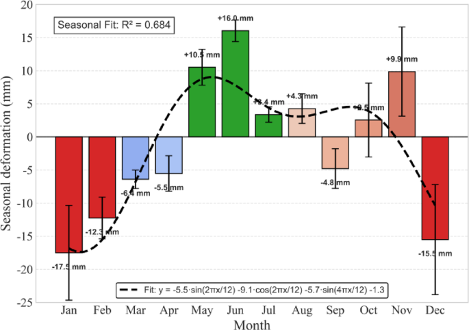 ・STLを用いて分解した季節成分を見ると、年間の変動幅は33.5mm(沈下が浅い時期と深い時期の差)となっており、5〜7月(雨期)は地下水が多く沈下が一時的に減速、12〜2月(乾期)は水分減少と地盤収縮により沈下が加速していることがわかった