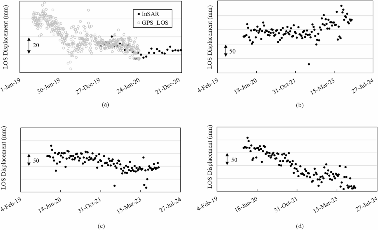 ・InSARのLOS変位を、近傍のGPS観測点のデータで検証した