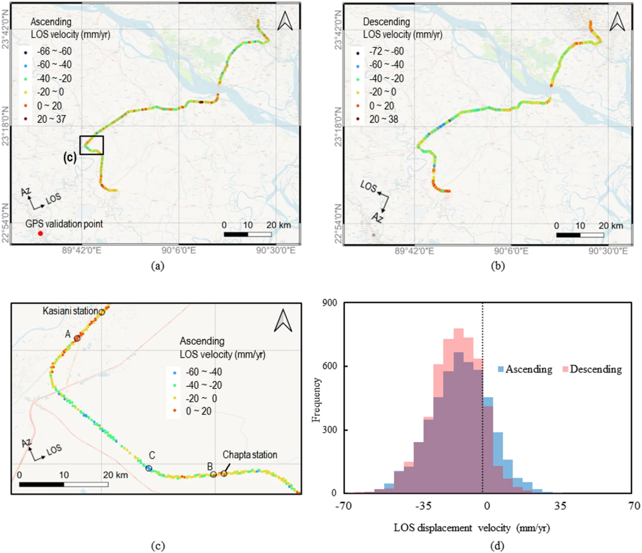 ・Sentinel-1の上り(Ascending)・下り(Descending)軌道のLOS変位速度を推定した結果、鉄道沿線の変位はおおよそ−70〜+40 mm/年の範囲に分布していた
