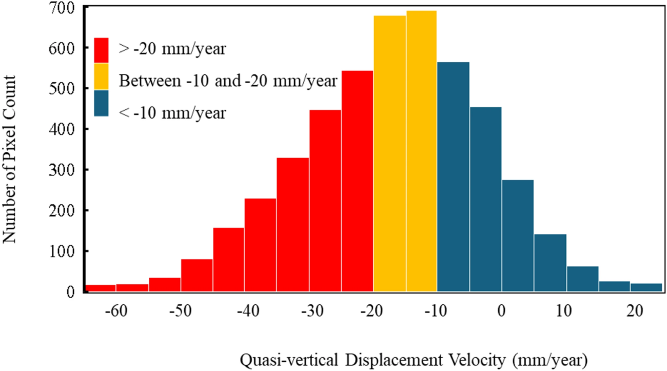 ・ヒストグラムから両軌道の分布はほぼ正規分布であり、平均速度は上りが−10mm/年、下りが−14 mm/年となっており、両データの傾向が一致しているため、鉄道盛土全体として沈下傾向にあると結論づけられる