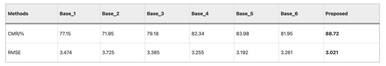 ・結果としては提案手法の平均CMRは86.11%となり、Base_1〜6との差は+8〜+20ポイントであった(RMSEも全手法で最小値)