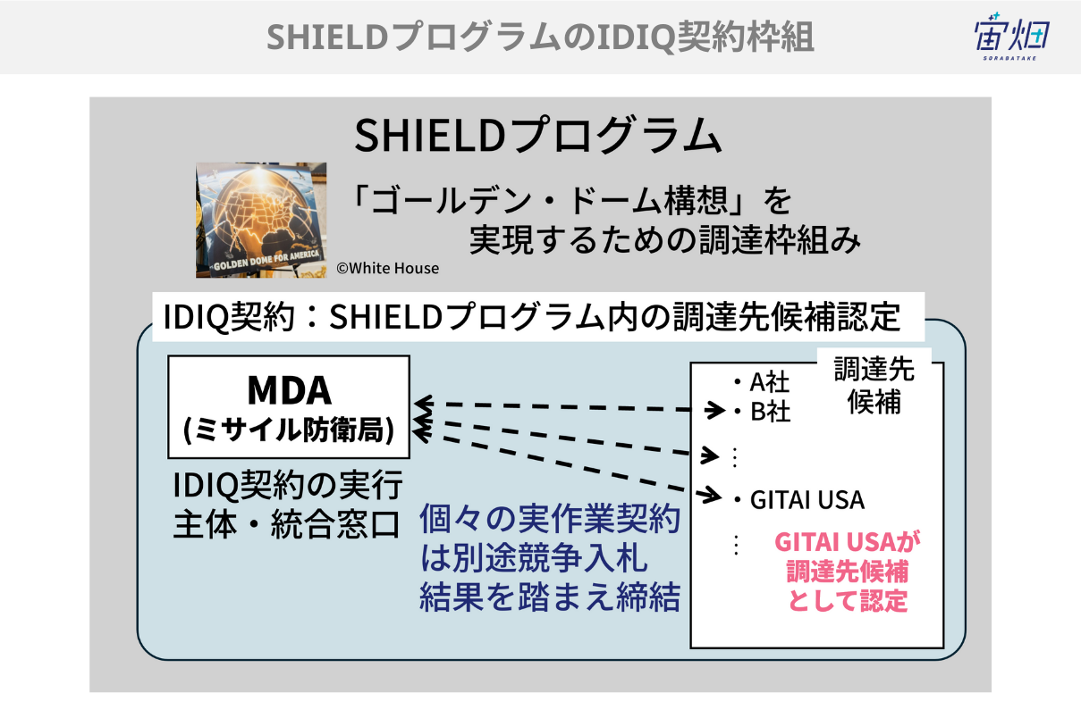 SHIELDプログラムにはすでに約2,100社が選定されています。選定企業の中でGITAIは日本に縁のある数少ない企業の一つです。GITAIがMDAと交わした契約の枠組を下記にまとめました。