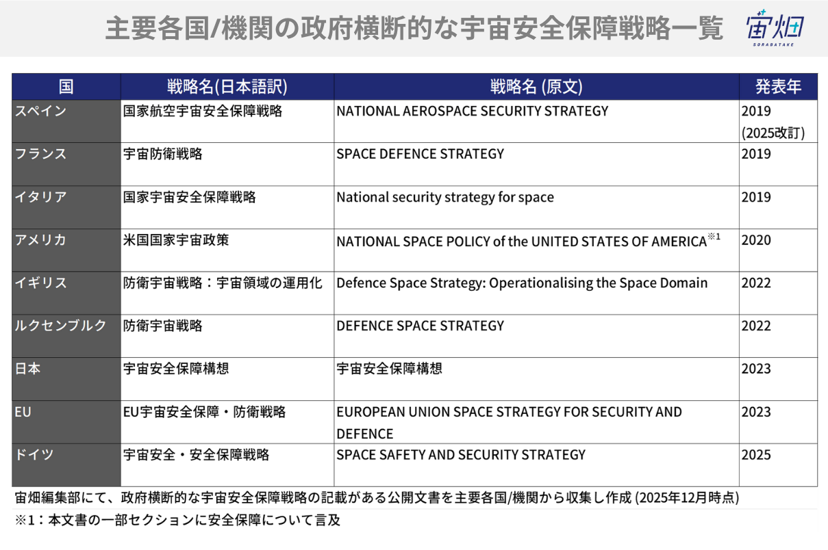 ちなみに、下記に示す通り、ドイツ以外の様々な国/機関からも政府横断的な宇宙安全保障戦略が発表されています。