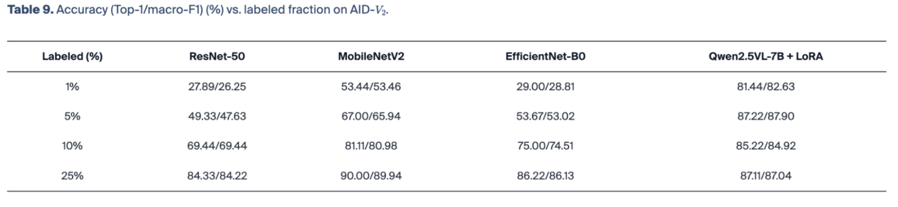 ・訓練データを用意したAIDの全体の1%しか使わなかった場合、従来のCNN (MobileNetV2)の正解率53.44%、従来のCNN (ResNet-50)は28%、本手法 (VLM + HPE)では正解率 が81.44%となり、少量の追加のファインチューニングでも大きな正解率の差が出る形となった