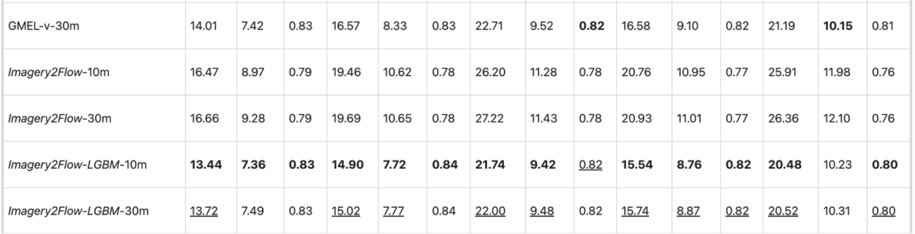 ・提案手法である「Imagery2Flow-LGBM(10m解像度)」が、ほぼ全ての指標で最高性能を記録した