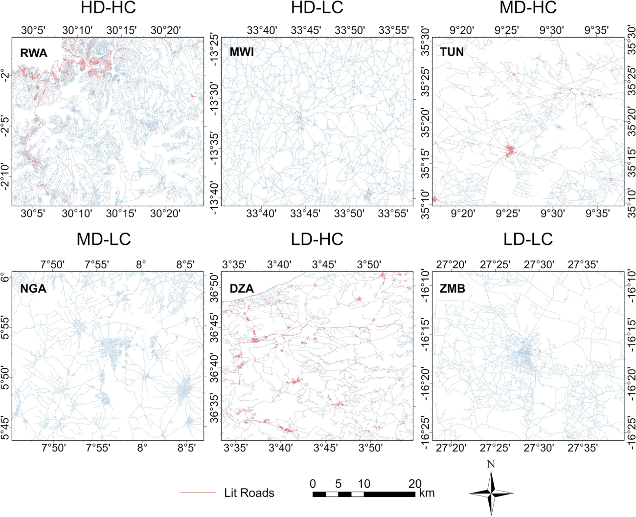 ・「道路は作ったが、電気は通っていない」状態の高密度/低照明 (HDLC)地域のウガンダ、マラウイなどもあれば、「道路は少ないが、主要道路にはしっかり照明がある」