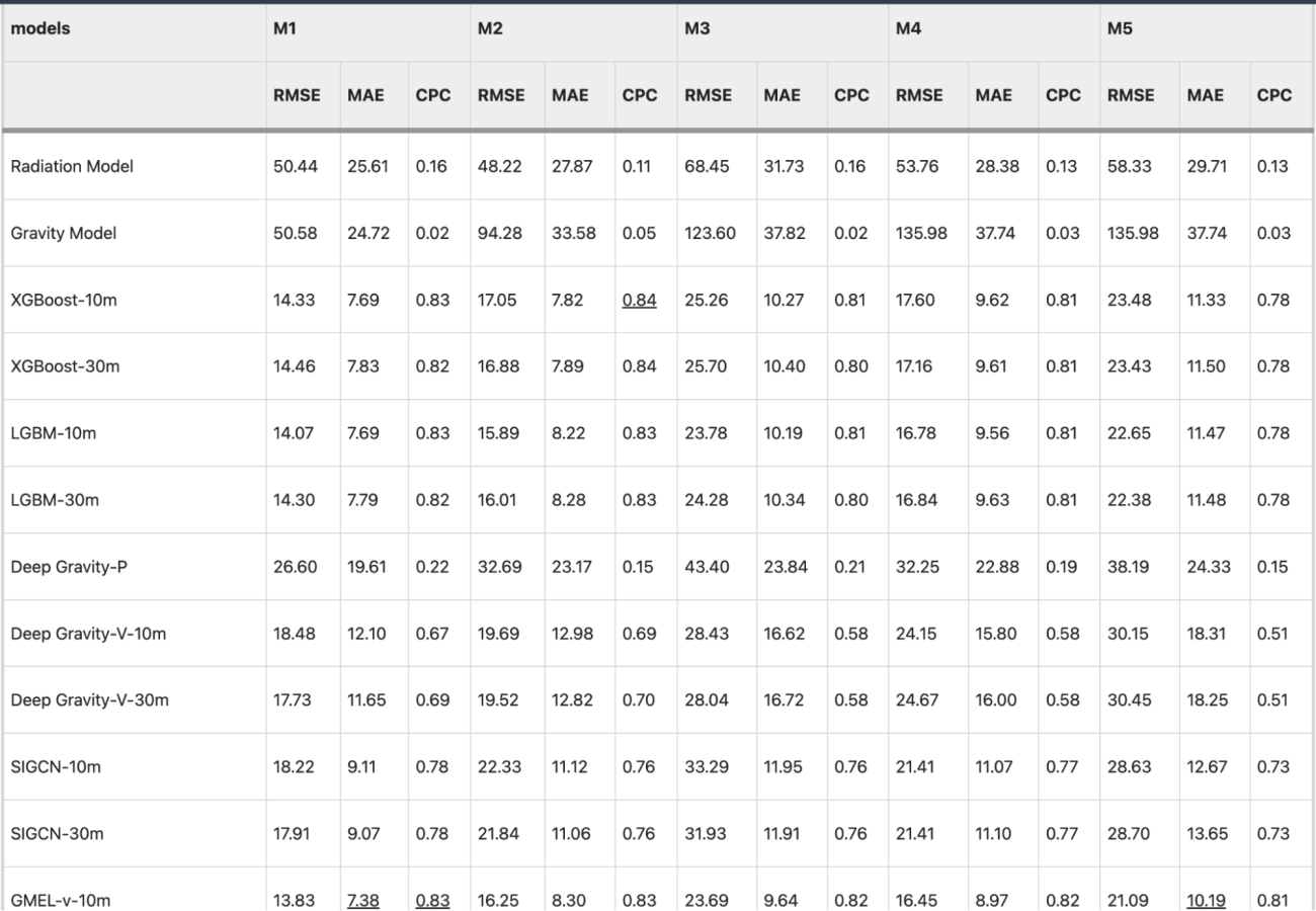 ・RMSE(誤差の大きさ)では、既存の高性能モデル(Deep Gravity-V)と比較して、誤差を4.5%〜13.9%削減した
