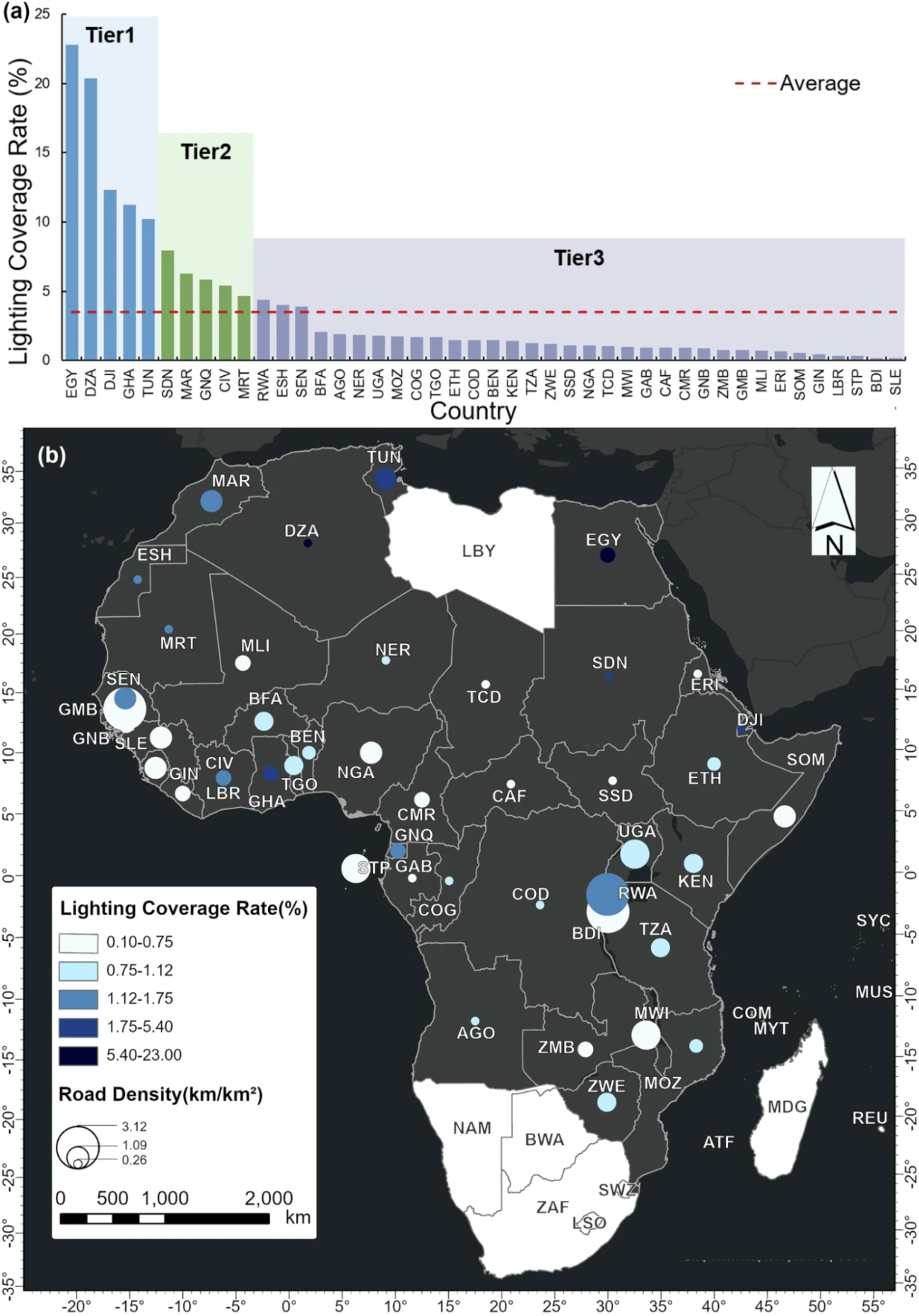 ・アフリカ全土の農村道路の平均照明率は3.52%に留まる