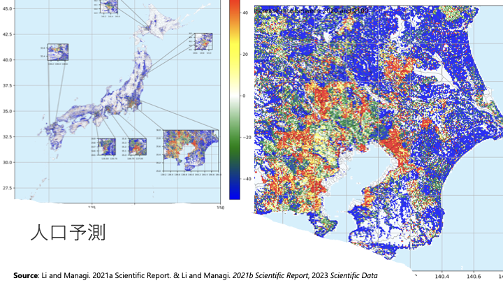馬奈木:最近は少しずつ取れるデータが増えてきています。例えば、収入が低い層(税金を払っていない層)が、日本国内でどこにどのくらい住んでいるかを、衛星画像を使って2100年まで予想することができました。