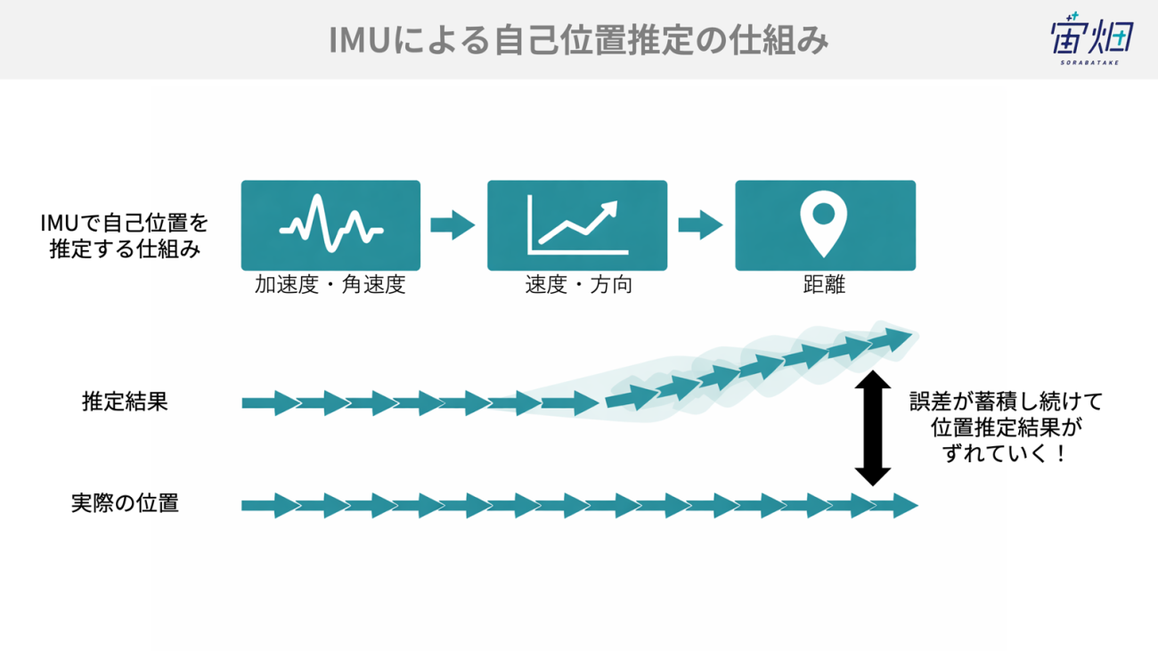 ただし、加速度計やジャイロなどIMUを構成するセンサーには測定の誤差(ドリフト)がつきものです。この誤差は時間とともに蓄積されて大きくなるため、IMU単独で長時間位置を推定し続けることは難しいという課題があります。
