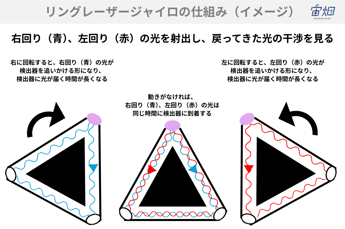 ロケットや人工衛星が利用するジャイロスコープ(リングレーザージャイロや光ファイバジャイロ)は、光が通る道筋(光路)の長さが運動によって変わったかのように見える現象を利用して、加速度や方位の変化を検出しています。この原理の基礎にあるのが、複数の波が重なったとき、波が強め合ったり弱まったりする「干渉」という現象です。