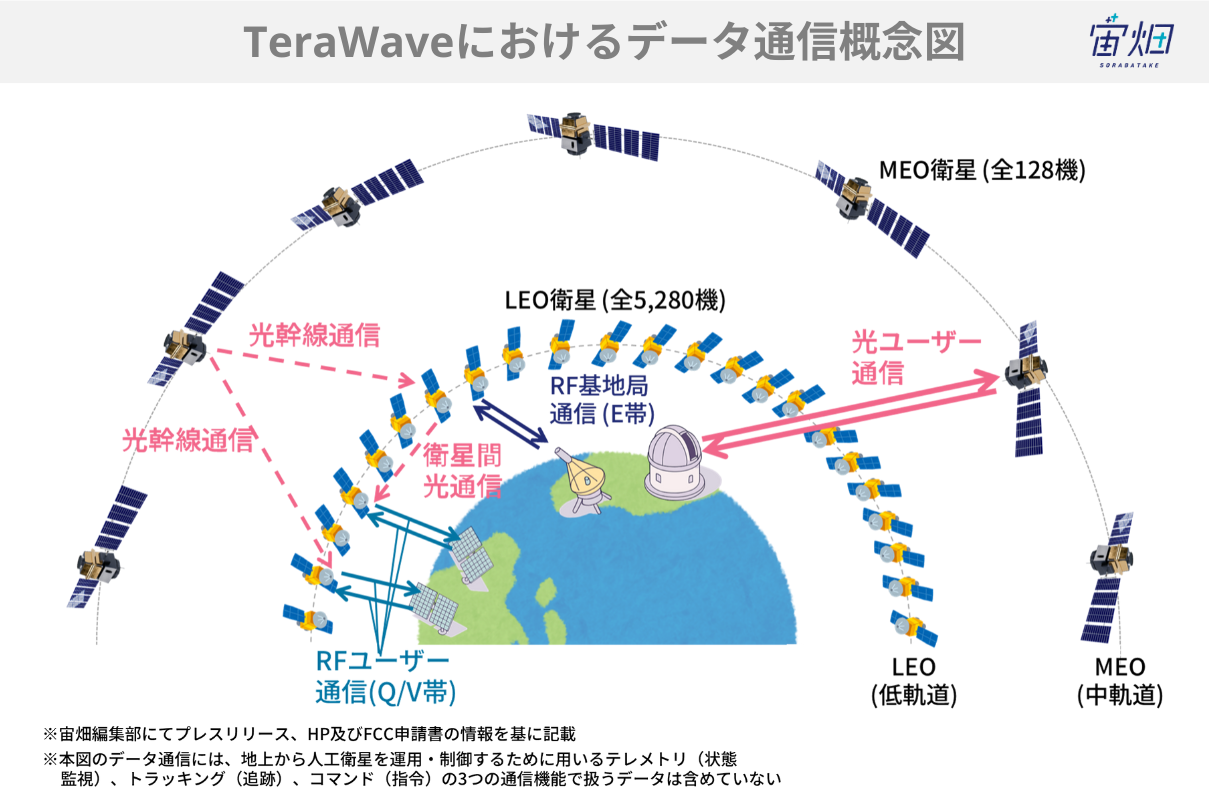 一方、TeraWaveはMEO衛星と地上の光端末の間でも光通信を行い、最大6Tbpsの通信容量を目指しています。
